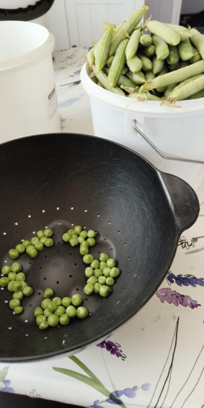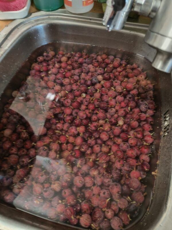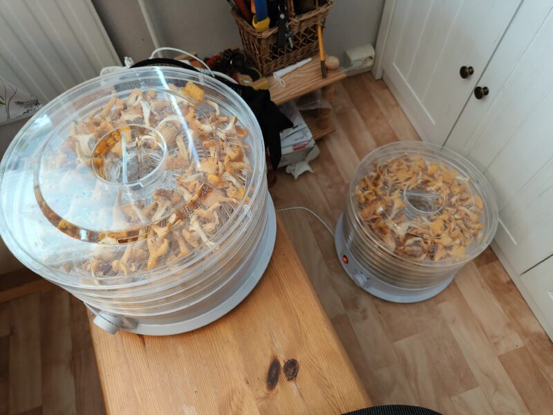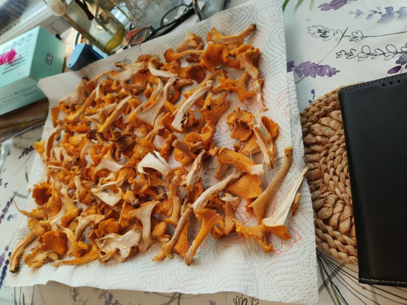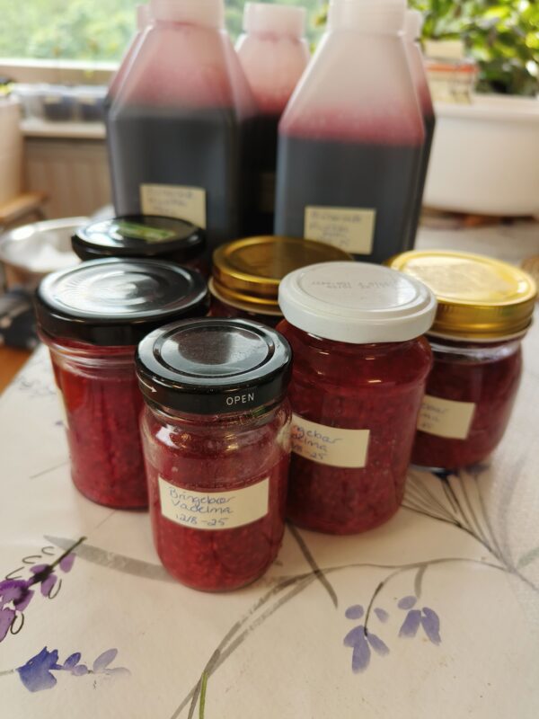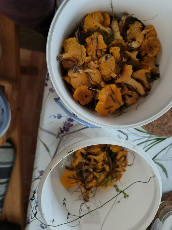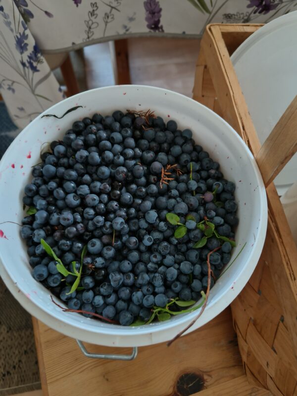 Siden jeg skrev sist har vi plukket nesten tyve liter kantareller, ti liter blåbær, 2 liter bringebær, jeg har plukket stikkelsbær og rips i hagen og vi har høstet ertene. Ertene skal jeg forvelle og fryse ned, og jeg skal lage litt syltetøy av noe av stikkelsbæra. Noe av det skal jeg også koke saft på sammen med rips, og soppen har jeg tørket.