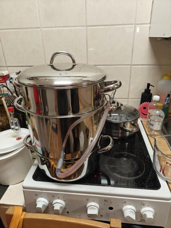 Nuvel, nok om dette. Gårdagen gikk i det klissete tegnet: Vi hadde honning overalt, men hadde heldigvis rulla ut malepapp på gulvet i garasjen. Til neste sesong må vi nesten bare skaffe oss ei honning-slynge selv, det er veldig tungvint at stakkars søskenbarnet til svigermor må drasse den store slynga si til oss for å hjelpe oss. Han er dessuten over 80 år, så jeg har dårlig samvittighet. Det var hans eget tilbud å komme og hjelpe oss for å slynge honningen men nå må vi nesten skaffe egen. I tillegg trenger vi litt ekstra tillbehør: Kakeholdere så vi kan løsne voksen på fronten og skrape den av, og stativ der de åpnede kakene kan stå mens noen slynges. Vi skulle kunne bygge disse av tre, men jeg vil gjerne ha rustfritt stål så de kan rengjøres ordentlig og ikke tar med seg eventuell smitte over til neste år. Vi behøver nok også to honning-siler til, og et antall bøtter for å oppbevare honningen i før den tappes. Vi bestilte to sånne honningtappekraner så vi skulle kunne lage opptil to store tappe-bøtter, i år har vi laga bare en siden vi kun har tre 20liters bøtter beregna til mat og som har lokk, men etter denne høsten med kjøpt sukkervann kommer vi til å ha fem-seks nye bøtter. Det trengs til neste år, og da kan vi nok også lage enda en bøtte dersom vi føler det behøves.